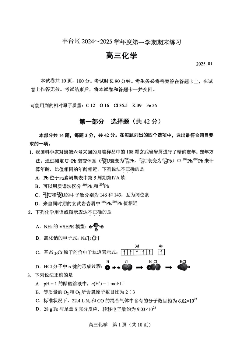 北京市丰台区2024-2025学年高三上学期期末考试 化学.pdf