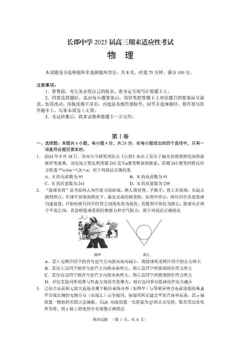 湖南省长郡中学2025届高三期末适应性考试 物理.pdf