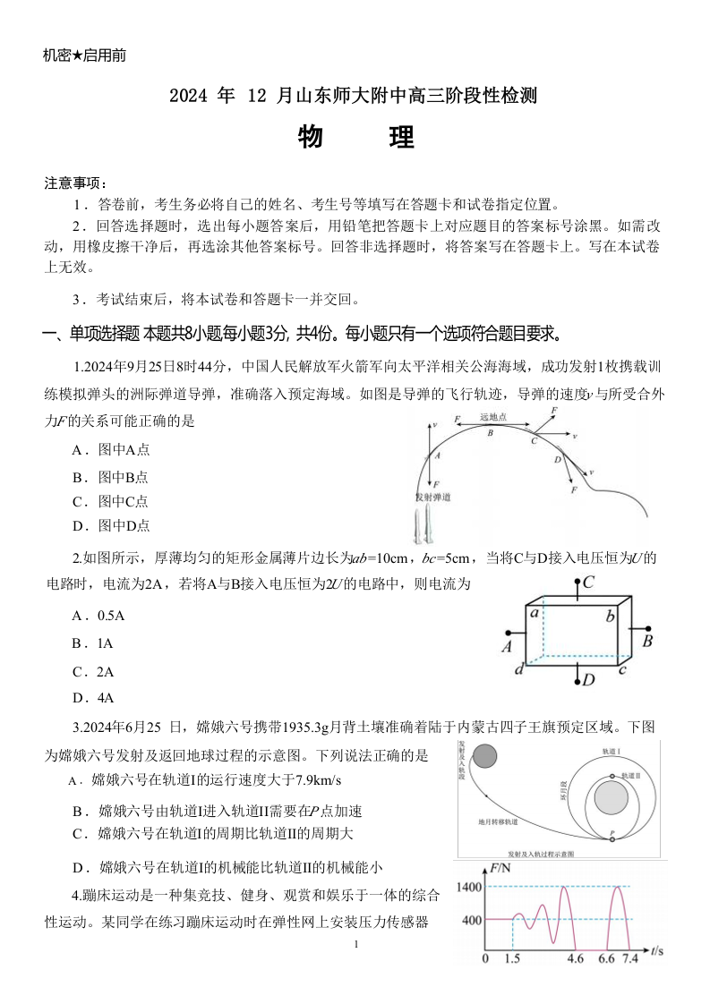 山东师范大学附属中学2025届高三上学期12月阶段性检测 物理.docx