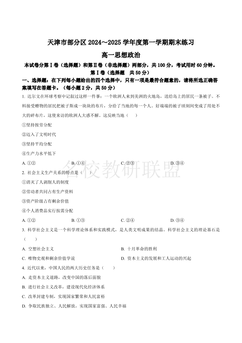 天津市部分区2024-2025学年高一上学期期末练习 政治.pdf