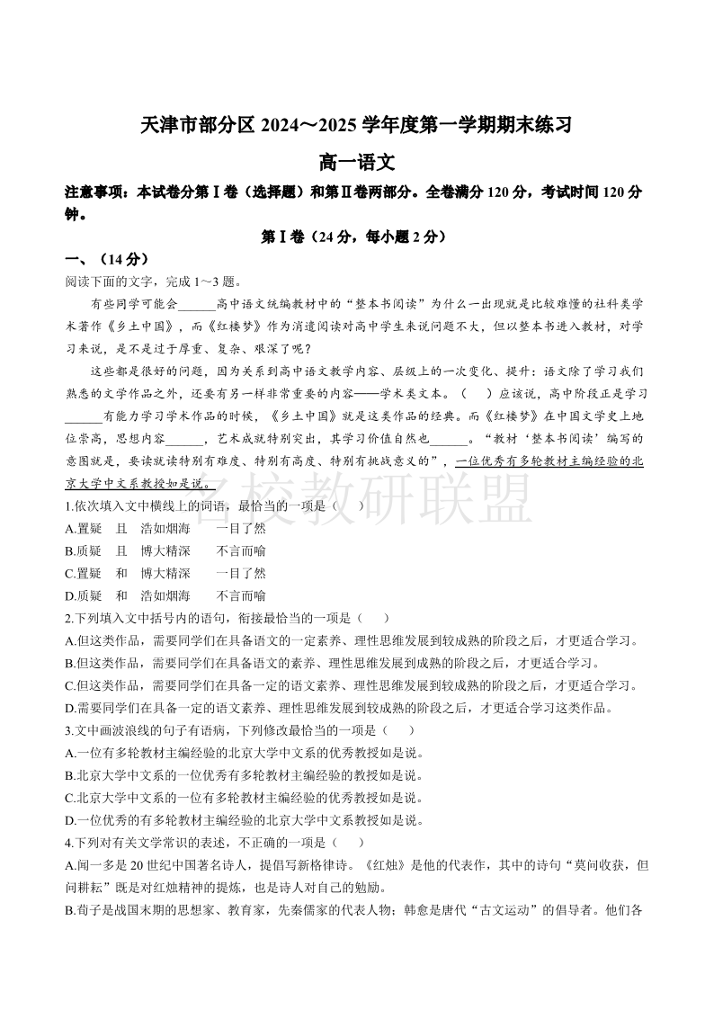 天津市部分区2024-2025学年高一上学期期末练习 语文.pdf