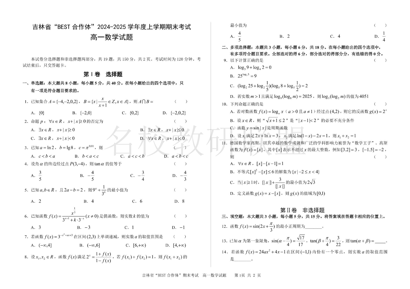 吉林省“BEST合作体”2024-2025高一学年上学期期末考试 数学.pdf