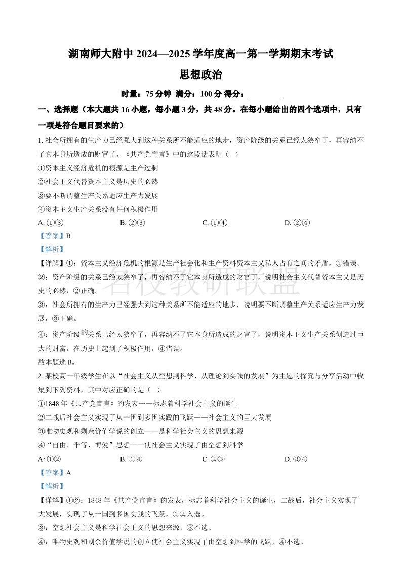 湖南师范大学附属中学2024-2025学年高一上学期1月期末考试 政治(含答案).pdf