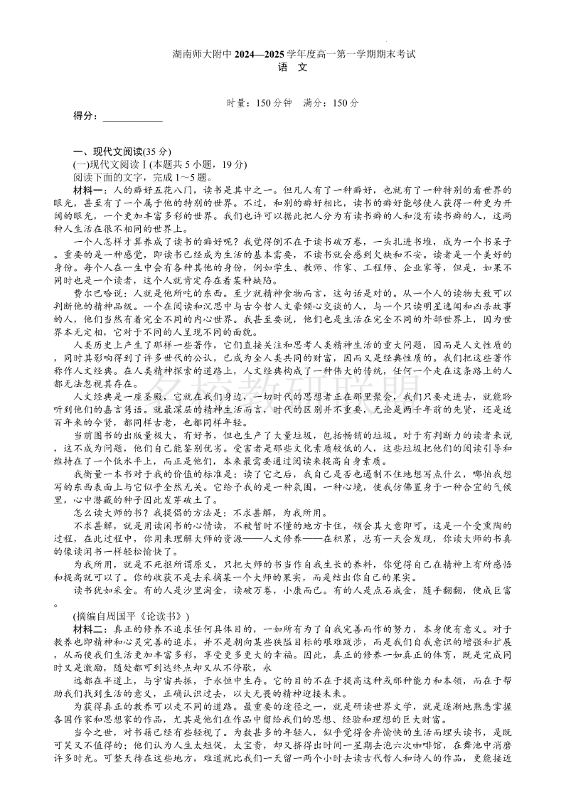 湖南师范大学附属中学2024-2025学年高一上学期1月期末考试 语文(含答案).pdf