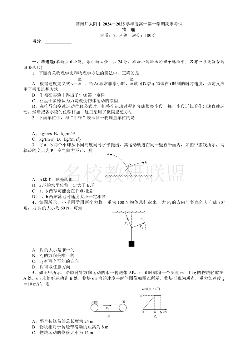 湖南师范大学附属中学2024-2025学年高一上学期1月期末考试 物理.pdf