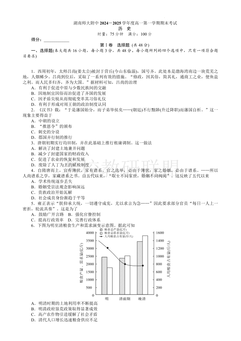 湖南师范大学附属中学2024-2025学年高一上学期1月期末考试 历史.pdf