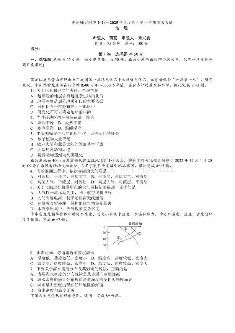 湖南师范大学附属中学2024-2025学年高一上学期1月期末考试 地理(含答案).pdf