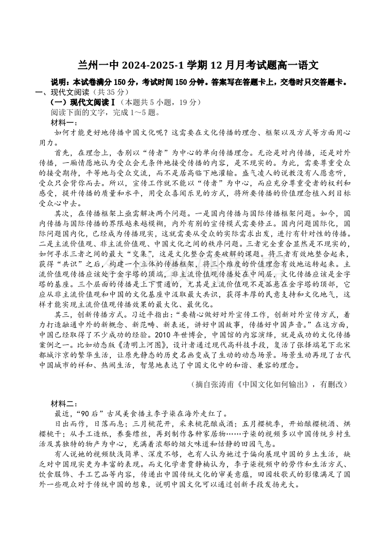 甘肃省兰州第一中学2024-2025学年高一上学期12月月考 语文.pdf