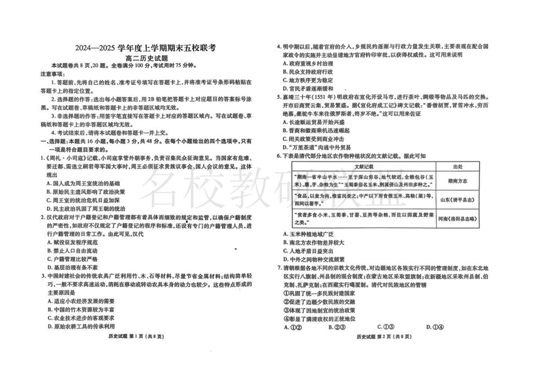 吉林省松原市五校2024-2025学年高二上学期期末联考 历史.pdf