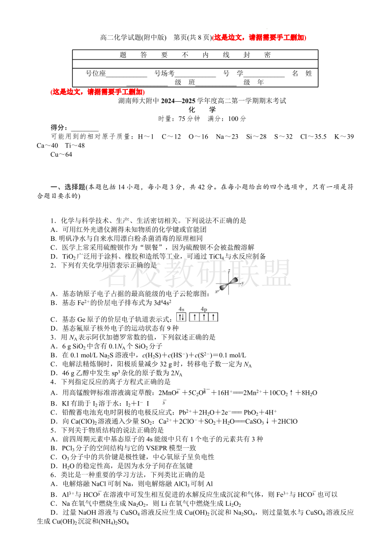 湖南省师范大学附属中学2024-2025学年高二上学期1月期末考试 化学.pdf