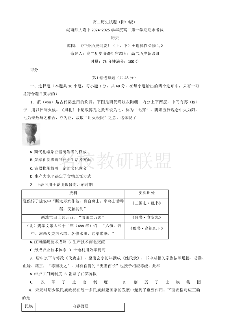 湖南省师范大学附属中学2024-2025学年高二上学期1月期末考试 历史.pdf