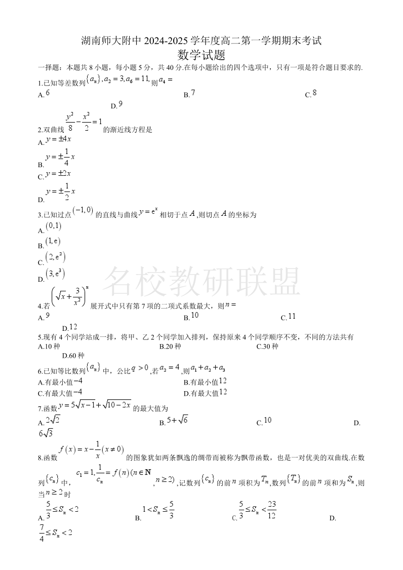 湖南省师范大学附属中学2024-2025学年高二上学期1月期末考试 数学.pdf