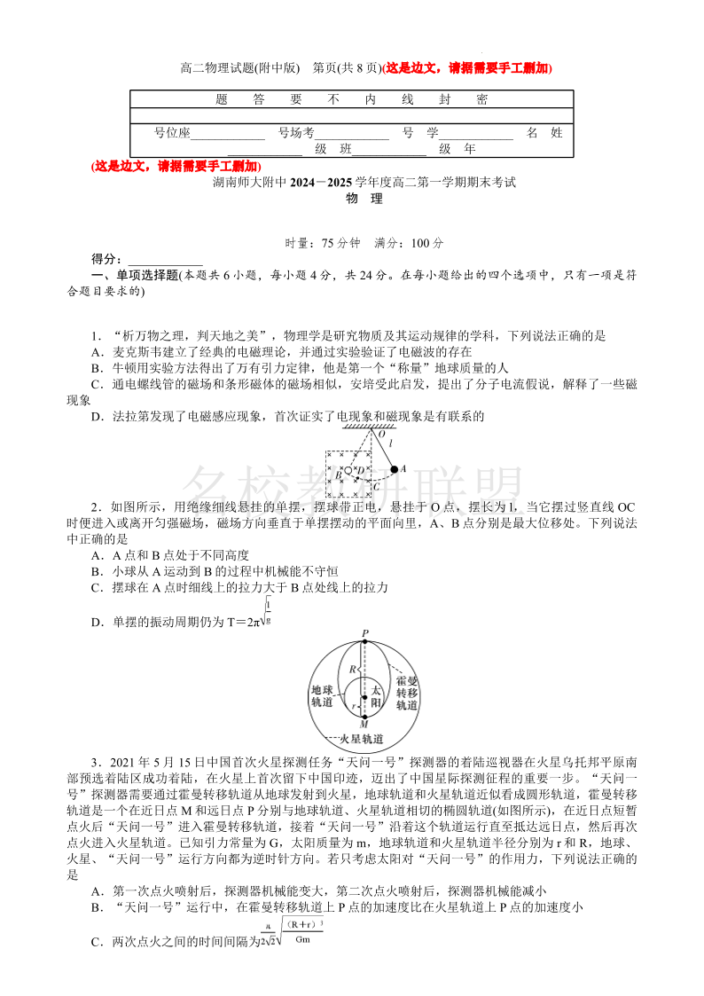 湖南省师范大学附属中学2024-2025学年高二上学期1月期末考试 物理.pdf