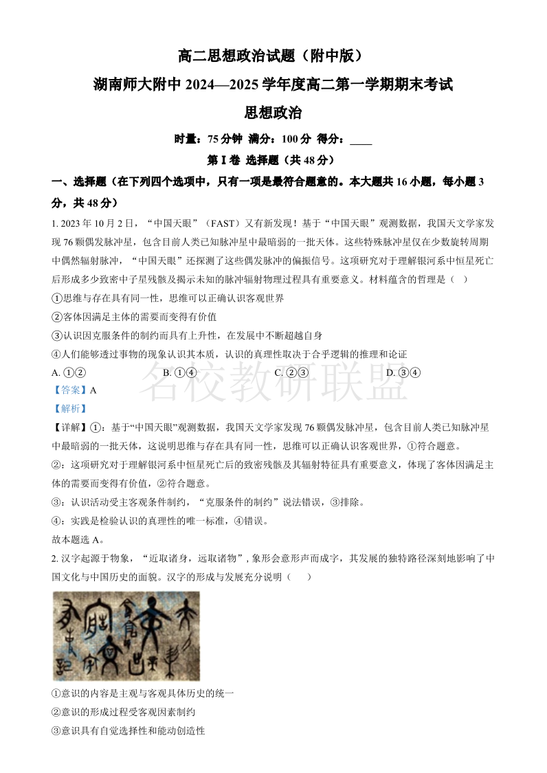 湖南省师范大学附属中学2024-2025学年高二上学期1月期末考试 政治.pdf