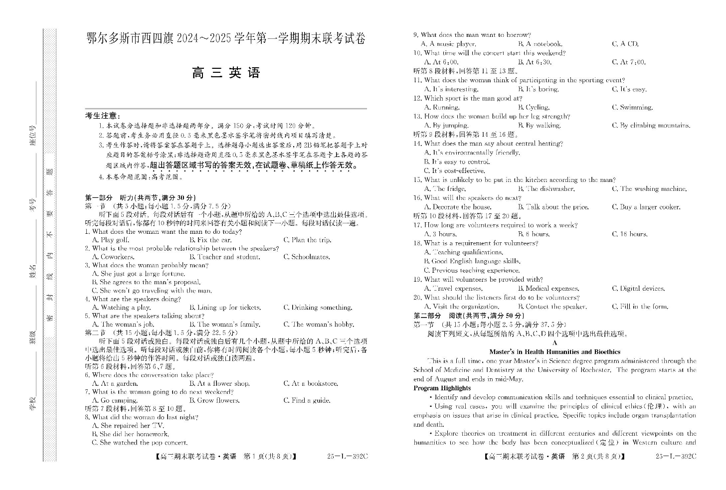 内蒙古鄂尔多斯市西四旗2025届高三上学期期末联考 英语.pdf