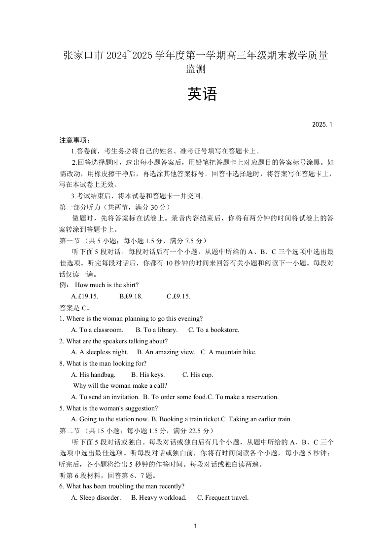 河北省张家口市2025届高三年级第一学期1月期末教学质量监测 英语.docx