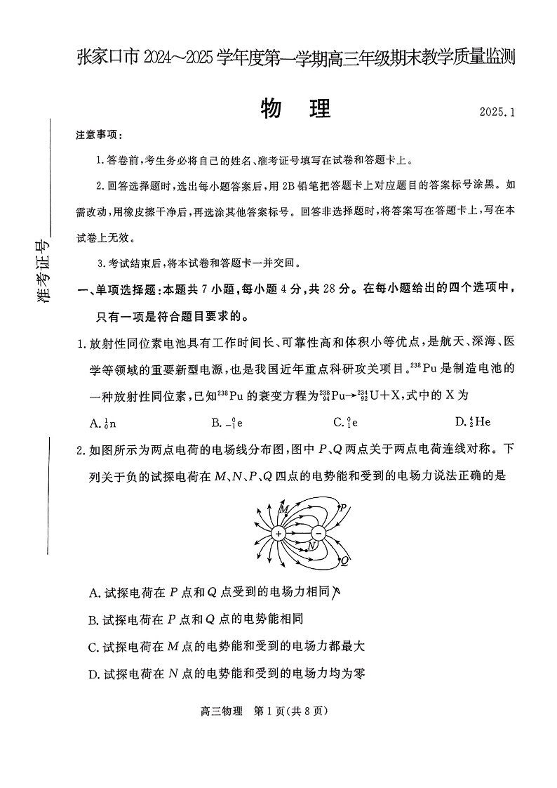 河北省张家口市2025届高三年级第一学期1月期末教学质量监测 物理.pdf