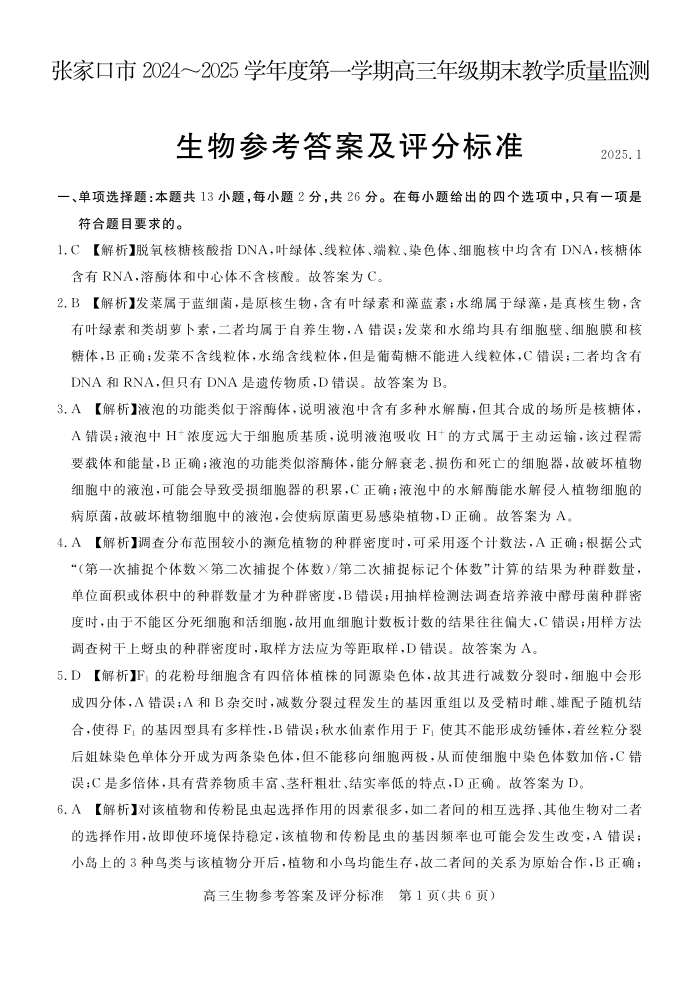 河北省张家口市2025届高三年级第一学期1月期末教学质量监测 生物答案.pdf