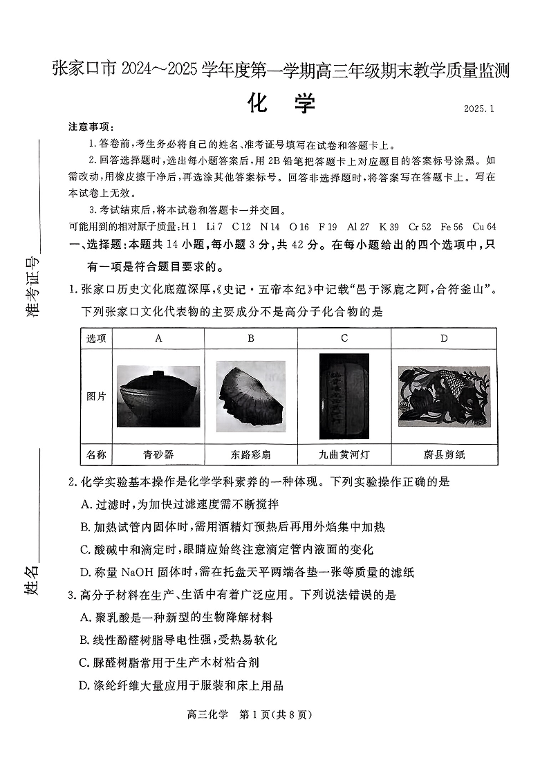 河北省张家口市2025届高三年级第一学期1月期末教学质量监测 化学.pdf