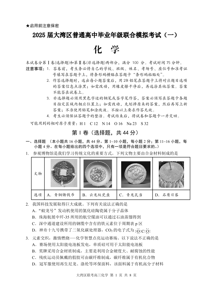 2025届广东省大湾区普通高中毕业年级联合模拟考试(一)化学.pdf