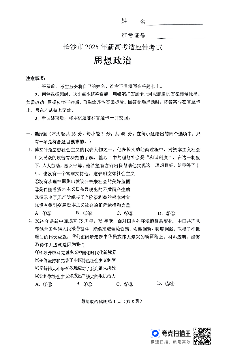 2025届湖南省长沙市高三上学期新高考适应性考试政治试题.pdf