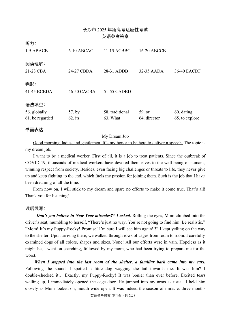 2025届湖南省长沙市高三上学期第一次适应性考试 英语参考答案.pdf