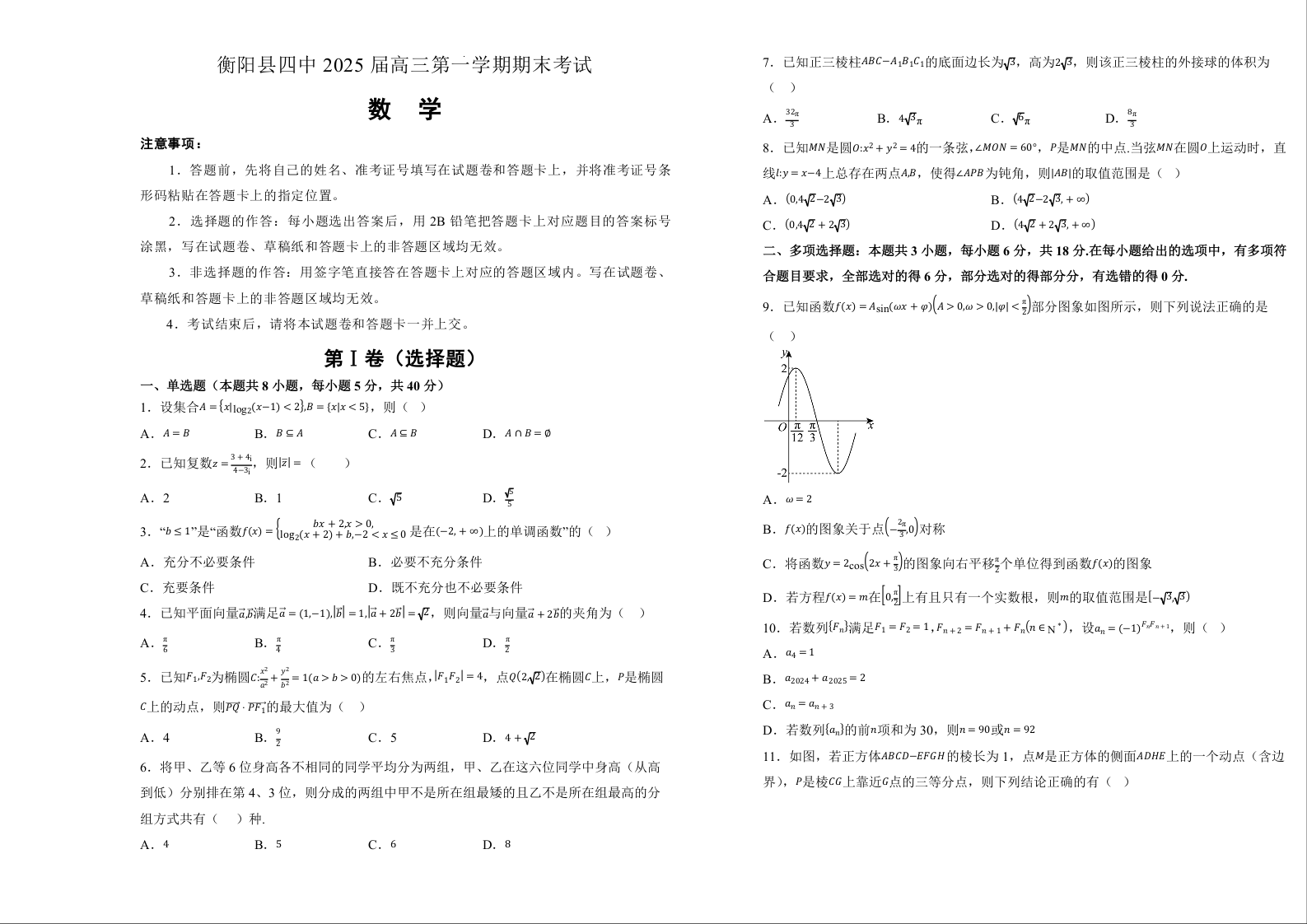 湖南省衡阳市衡阳县四中2025届高三第一学期期末考试 数学.docx