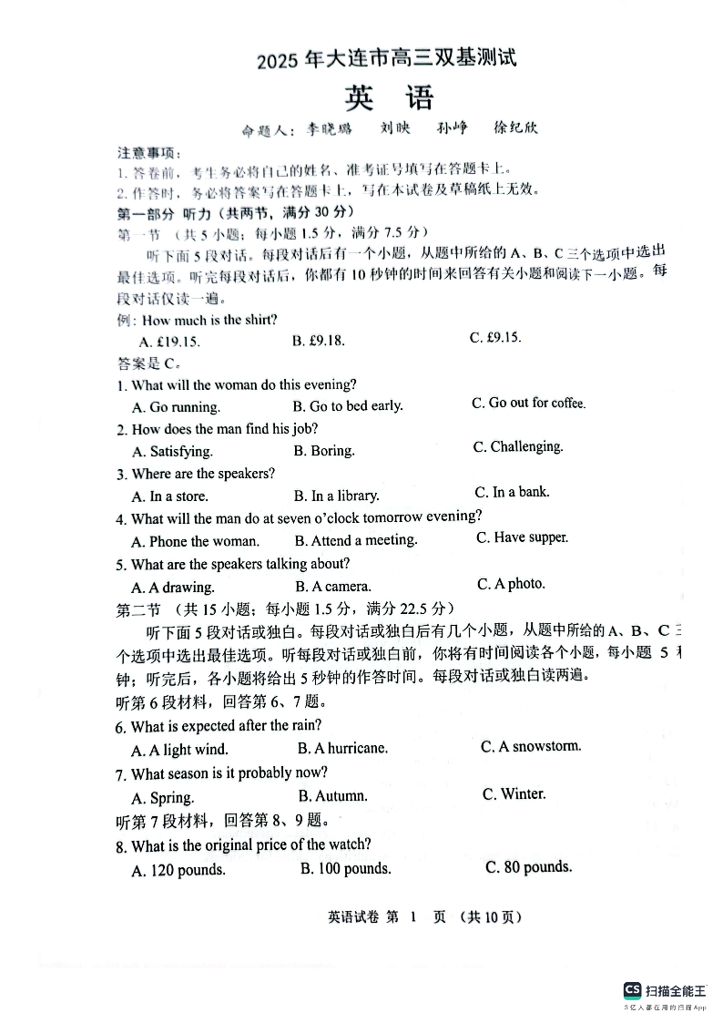 2025年大连市高三双基考试 英语.pdf