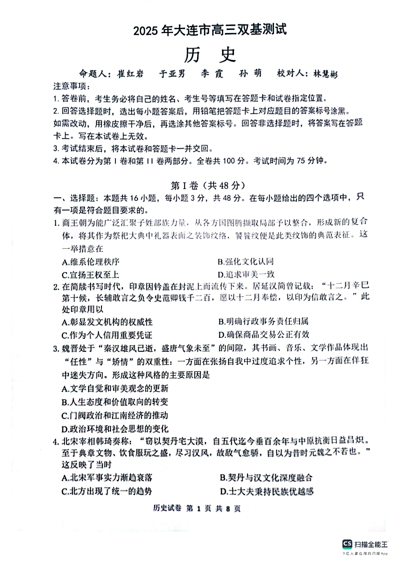 2025年大连市高三双基考试 历史.pdf