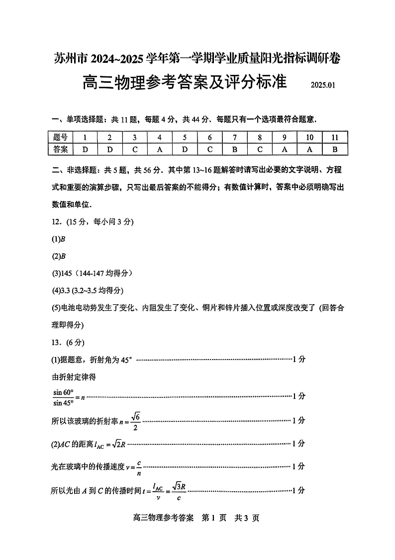 苏州市2025届高三第一学期学业期末质量阳光指标调研卷 物理答案.pdf