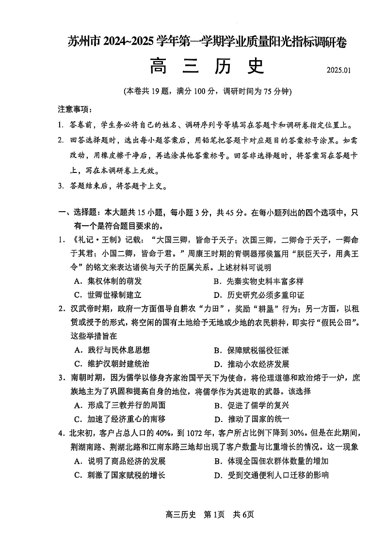 苏州市2025届高三第一学期学业期末质量阳光指标调研卷 历史.pdf