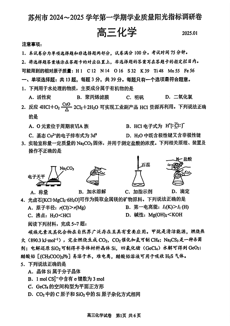 苏州市2025届高三第一学期学业期末质量阳光指标调研卷 化学.pdf