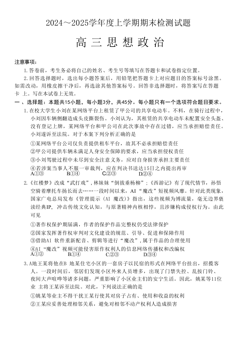 山东省潍坊市2025届高三上学期1月期末考试 政治.docx