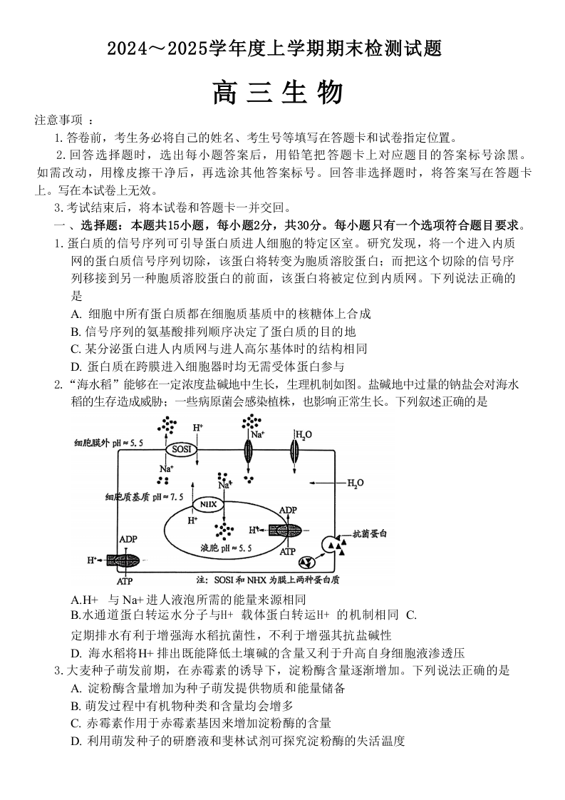 山东省潍坊市2025届高三上学期1月期末考试 生物.docx