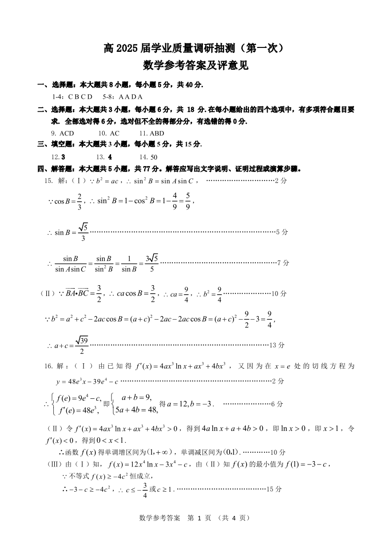重庆市主城五区高2025届学业质量调研抽测(第一次)数学答案.pdf
