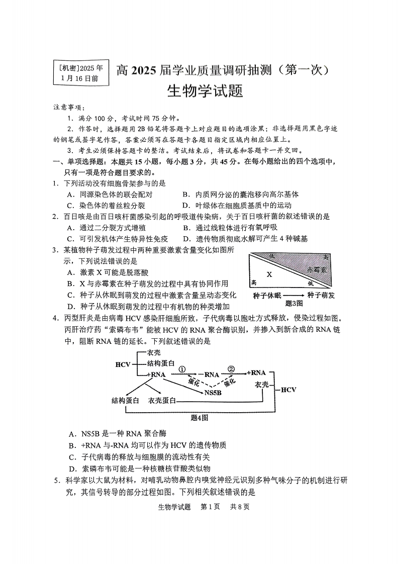 重庆市主城五区高2025届学业质量调研抽测(第一次)生物.pdf