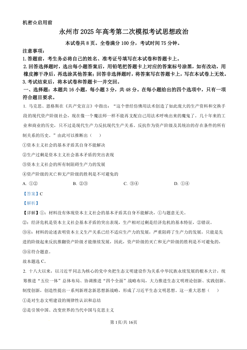 湖南省永州市2025年高考第二次模拟考试 政治答案.docx