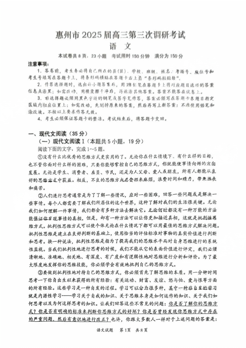 广东省惠州市2025届高三第三次调研考试 语文.pdf