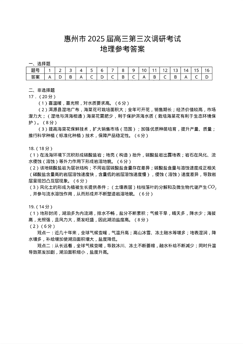 广东省惠州市2025届高三第三次调研考试 地理答案.pdf