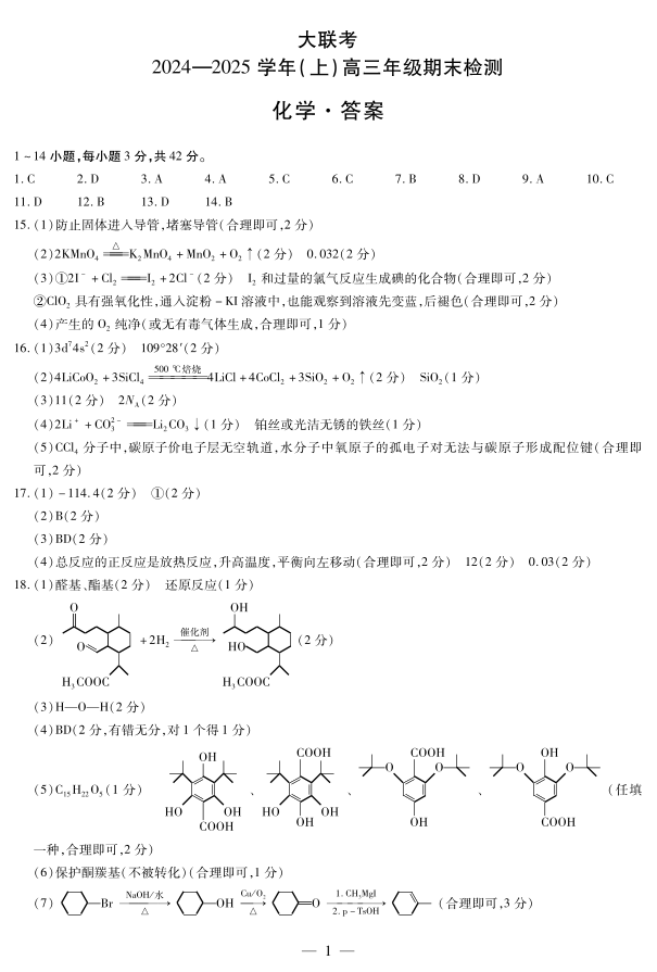 河南省天一大联考2025届高三上学期1月期末检测 化学答案.pdf