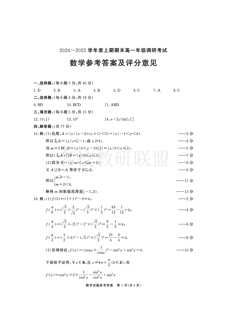 四川省成都市2027届高一上期期末统一调研考试 数学答案.pdf