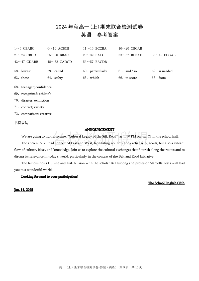 重庆高一期末考试 英语答案.pdf