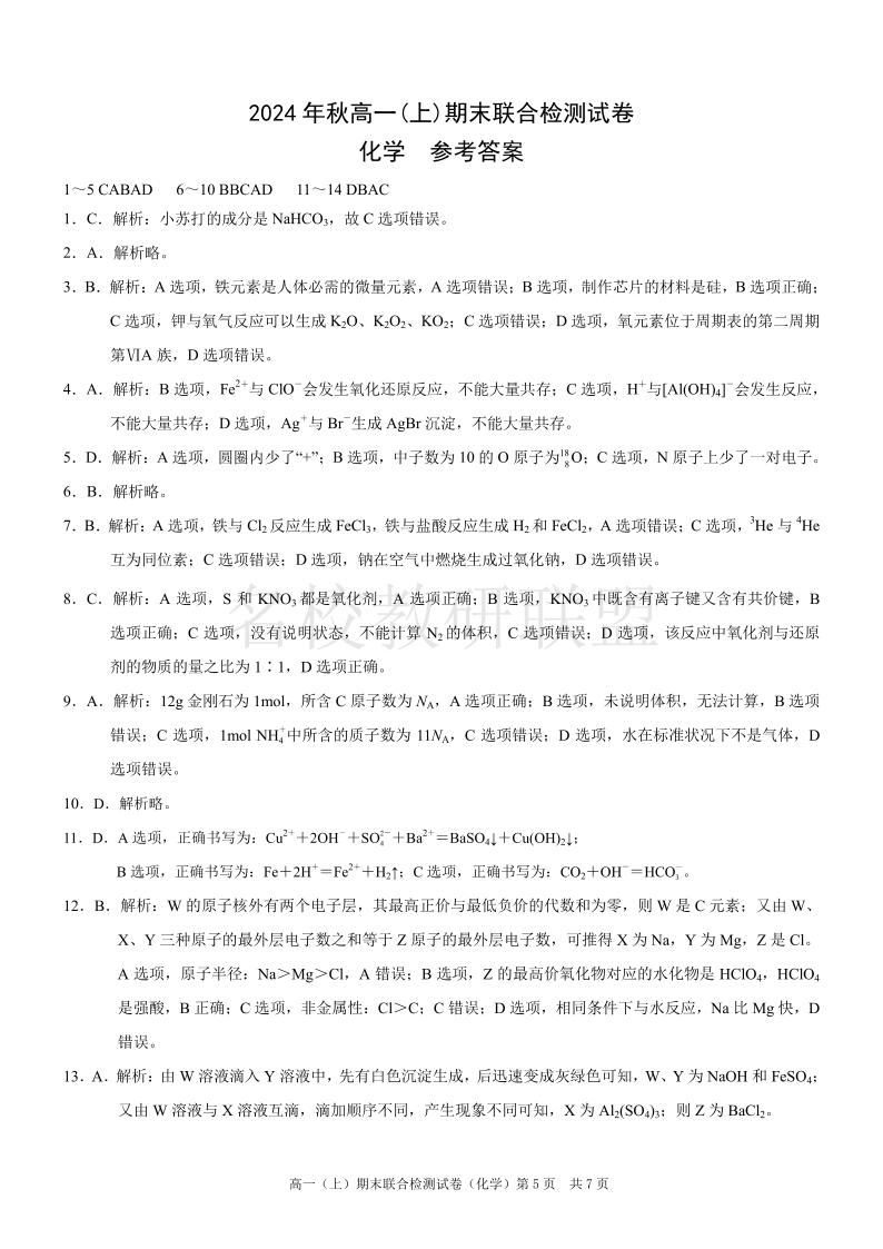 重庆高一期末考试 化学答案.pdf