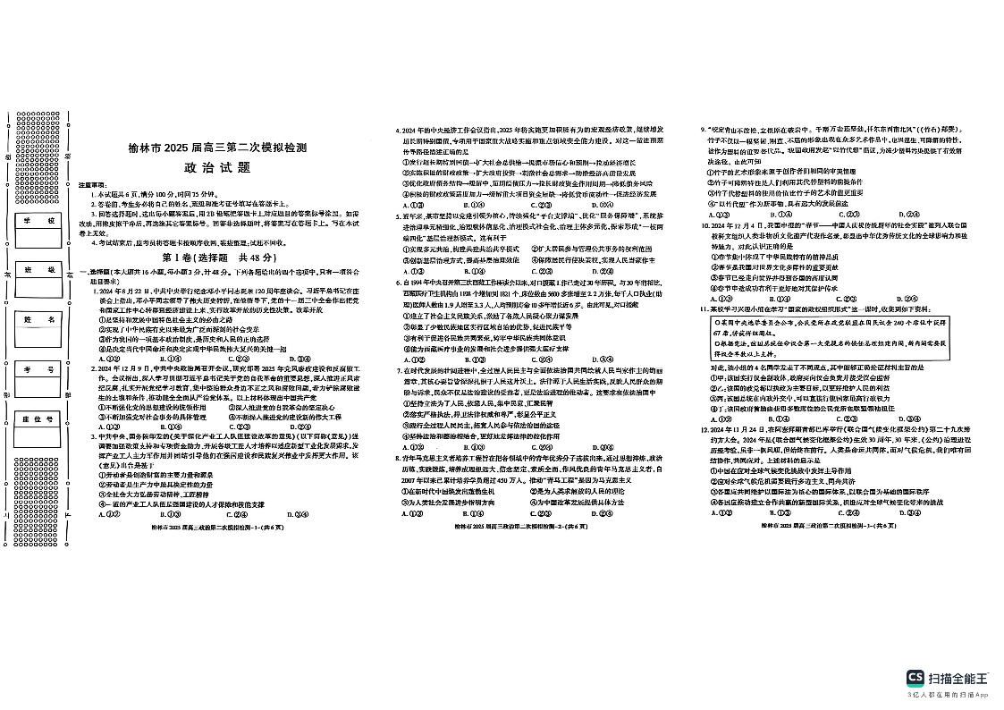 陕西省榆林市2025届高三上学期第二次模拟检测(榆林二模)政治.pdf