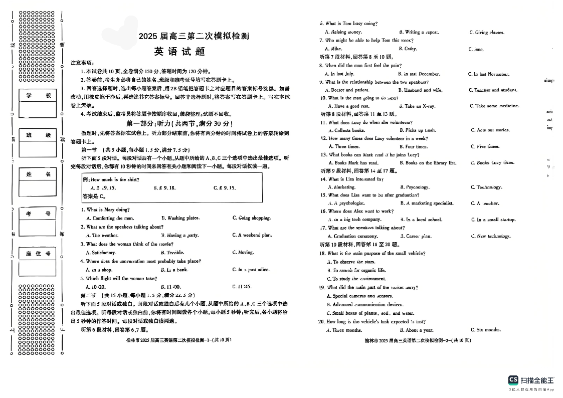 陕西省榆林市2025届高三上学期第二次模拟检测(榆林二模)英语.pdf