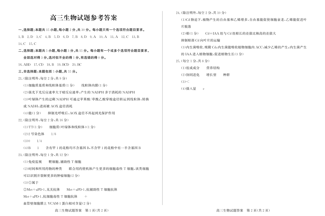 山东省德州市2025届高三上学期1月期末考试 生物答案.pdf
