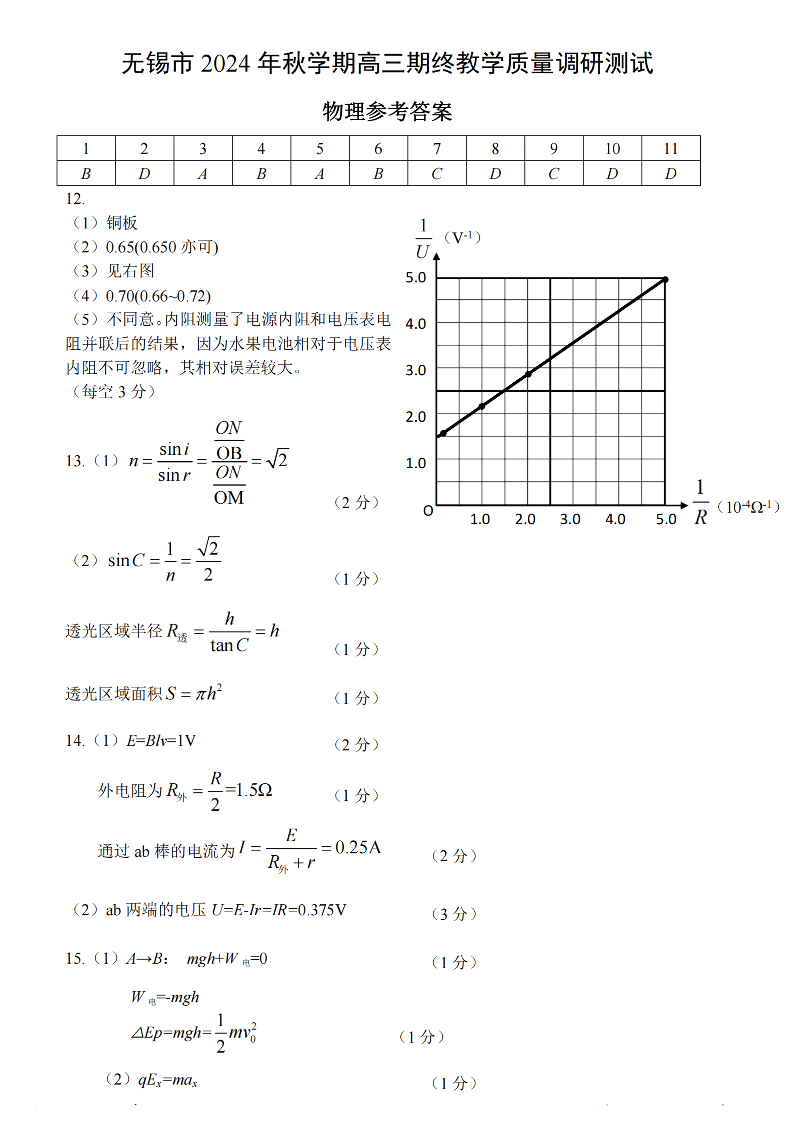 江苏省无锡市2024年秋季学期上学期高三期终教学质量调研测试 物理答案.pdf