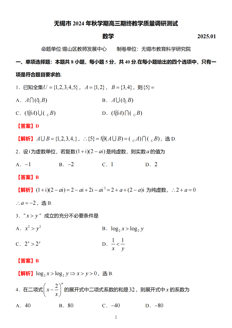 江苏省无锡市2024年秋季学期上学期高三期终教学质量调研测试 数学答案.pdf