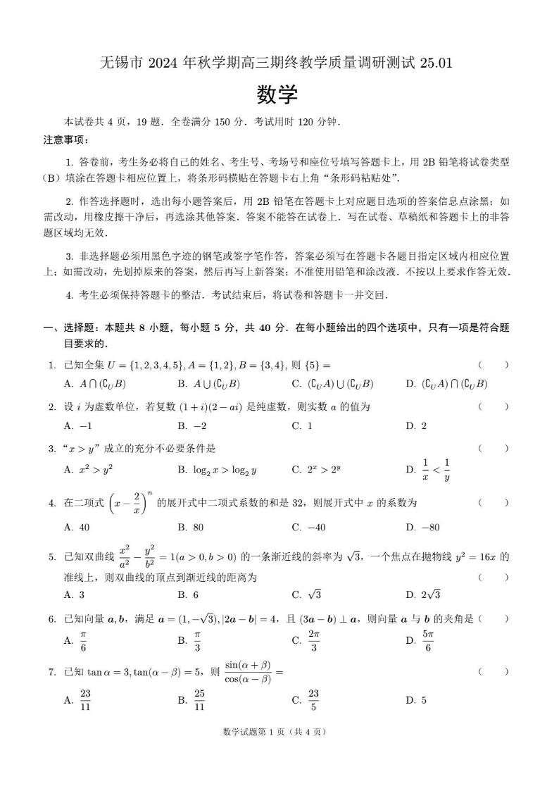 江苏省无锡市2024年秋季学期上学期高三期终教学质量调研测试 数学.pdf