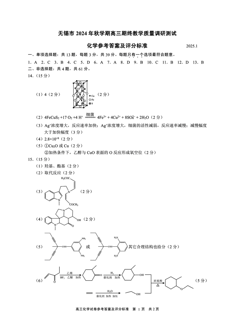 江苏省无锡市2024年秋季学期上学期高三期终教学质量调研测试 化学答案.pdf